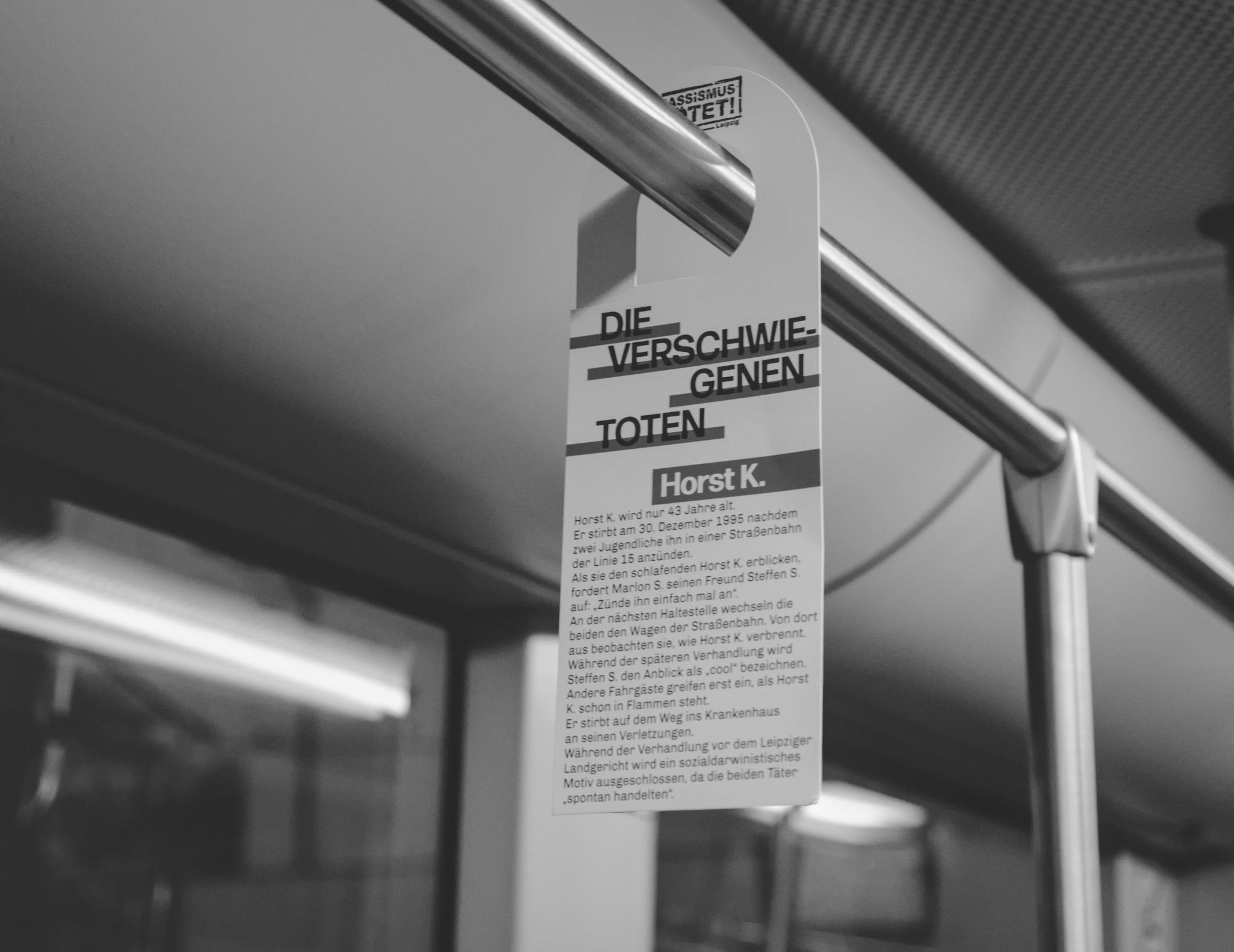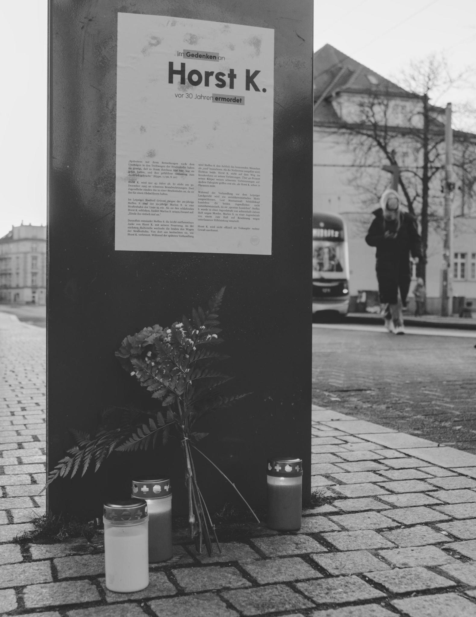 Heute vor 30 Jahren, am 30. Dezember 1995, kurz vor 21 Uhr, betreten zwei junge Männer an einer Haltestelle in Leipzig-Grünau die Straßenbahn der Linie 15. Steffen S. (20 Jahre) und Marlon S. (19 Jahre) treffen dort auf den schlafenden Horst K. Sie halten ihn für einen Obdachlosen und Marlon S. fordert seinen Freund auf: „Zünde ihn einfach mal an.“ Steffen S. folgt der Aufforderung seines Freundes und entzündet die leicht entflammbare Jacke Horst K.s mit seinem Feuerzeug. An der nächsten Haltestelle wechseln die beiden den Wagen der Straßenbahn und beobachten von dort aus, wie Horst K. verbrennt. Erst jetzt greifen andere Fahrgäste ein. Nachdem die Notbremse ausgelöst wird, flüchten Steffen S. und Marlon S.